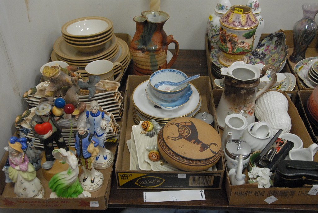 Five box lots pair of covered jars, china, glassware, figures, alabaster candlestick, etc.