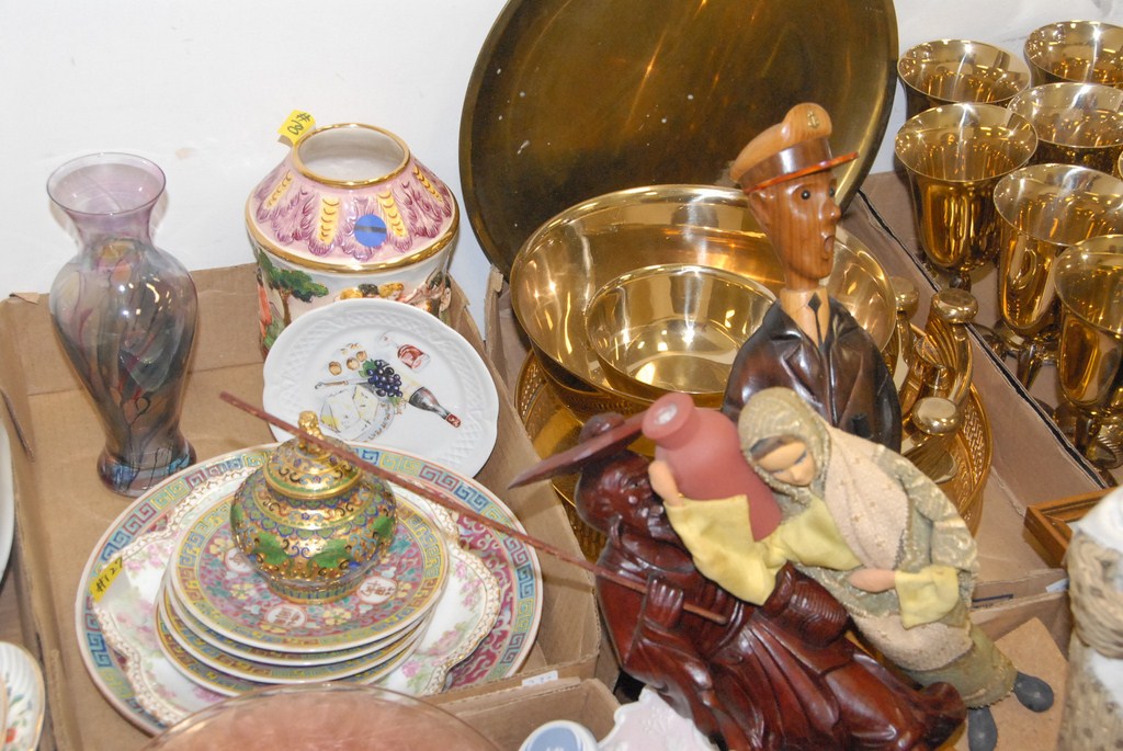 Six box lots brassware, stems, bowls, Chinese style porcelain, depression glass plates, wooden carved figures, brass boxes, etc.