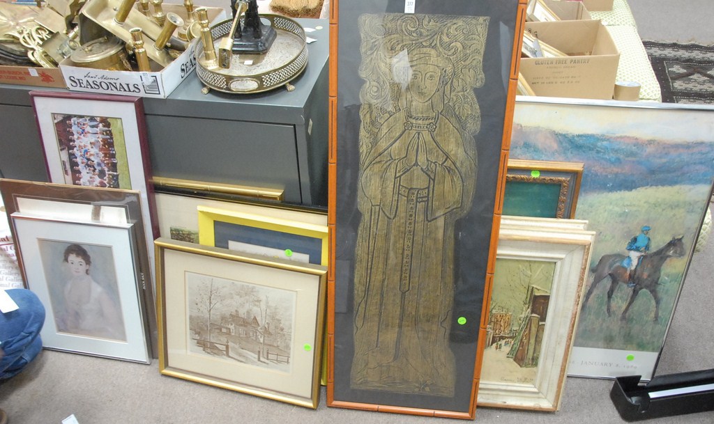 Large group of framed prints.