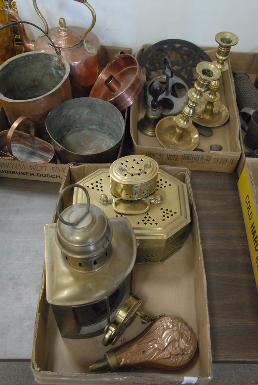 Three box lots brass lot, copper and brass powder horn, copper tea kettle, iron coin safe, and misc.