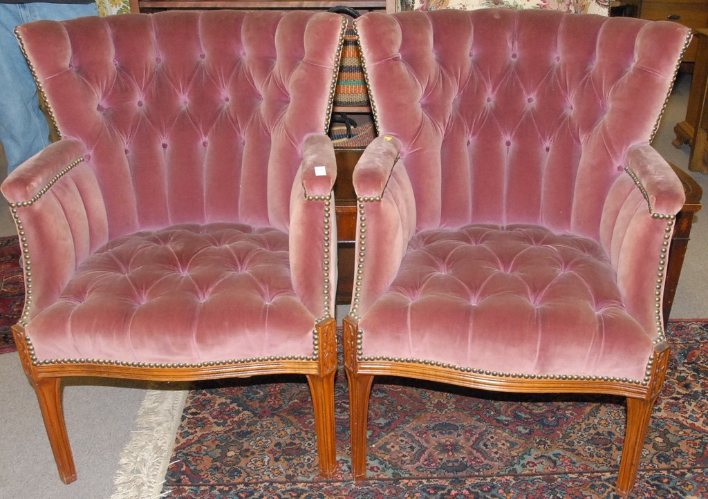 Pair of mauve covered barrel back tufted armchairs.