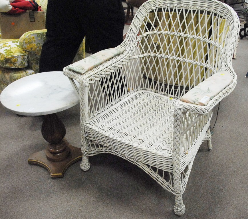 Three piece lot whicker armchair, floor lamp, and small marble top stand.