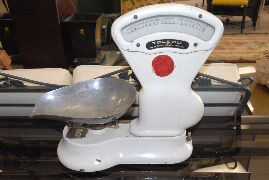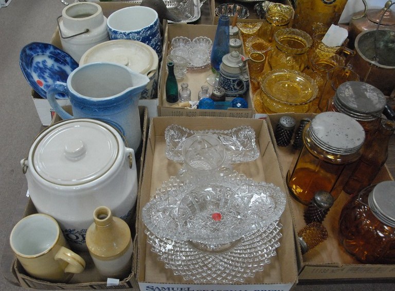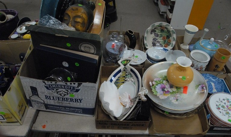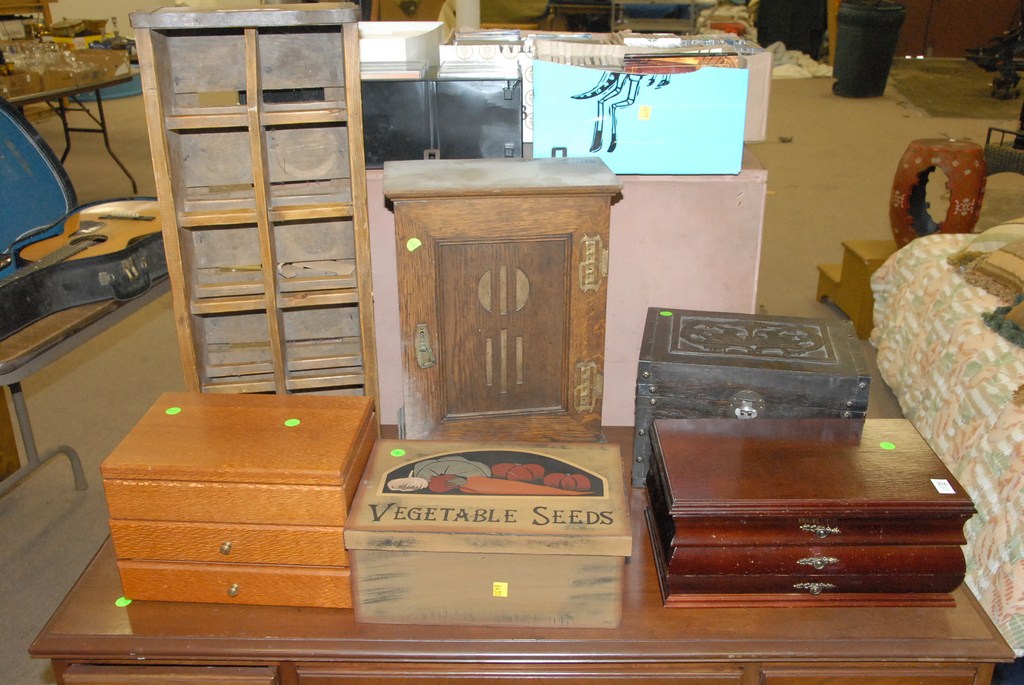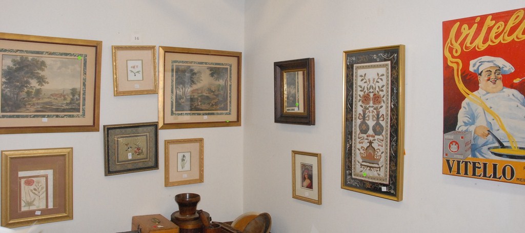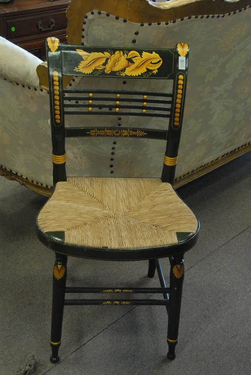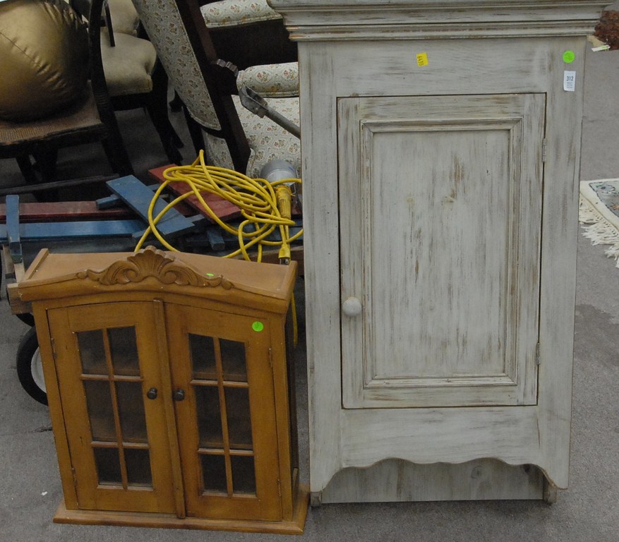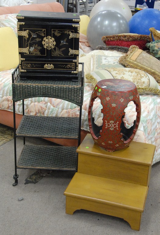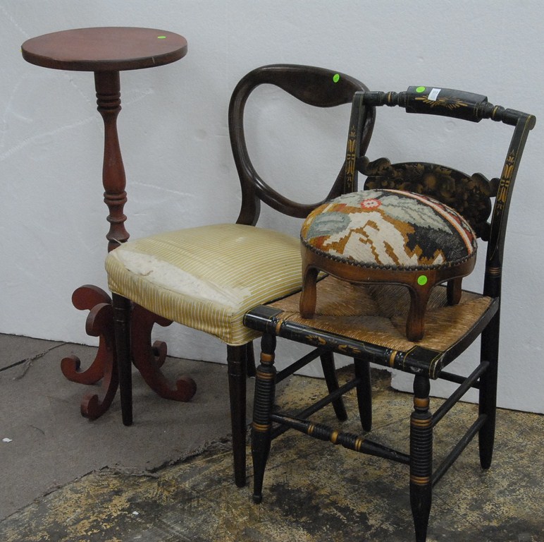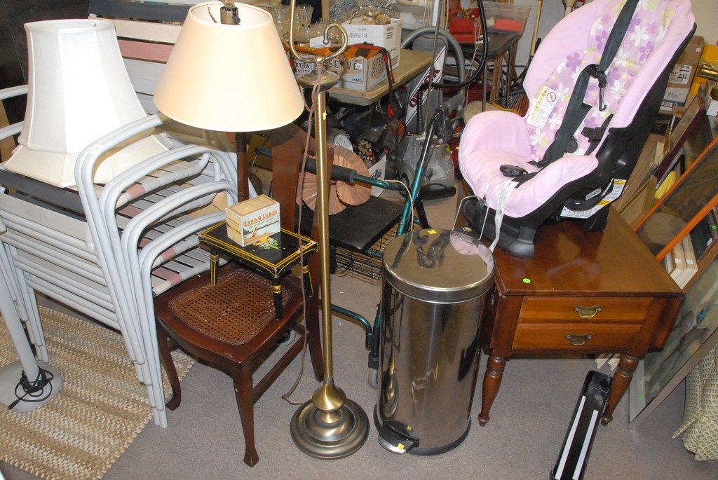 Group lot side chair, outdoor chairs, outdoor chairs, walker, two floor lamps, small bookcase, suitcase, trash can, car seat, and cherry, and Hitchcock bench.