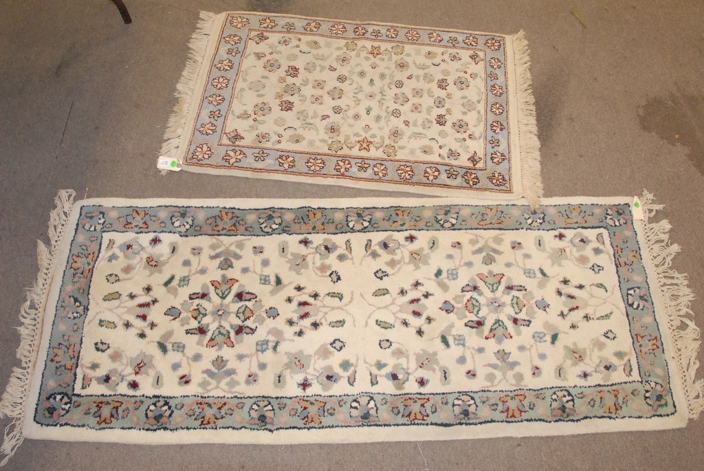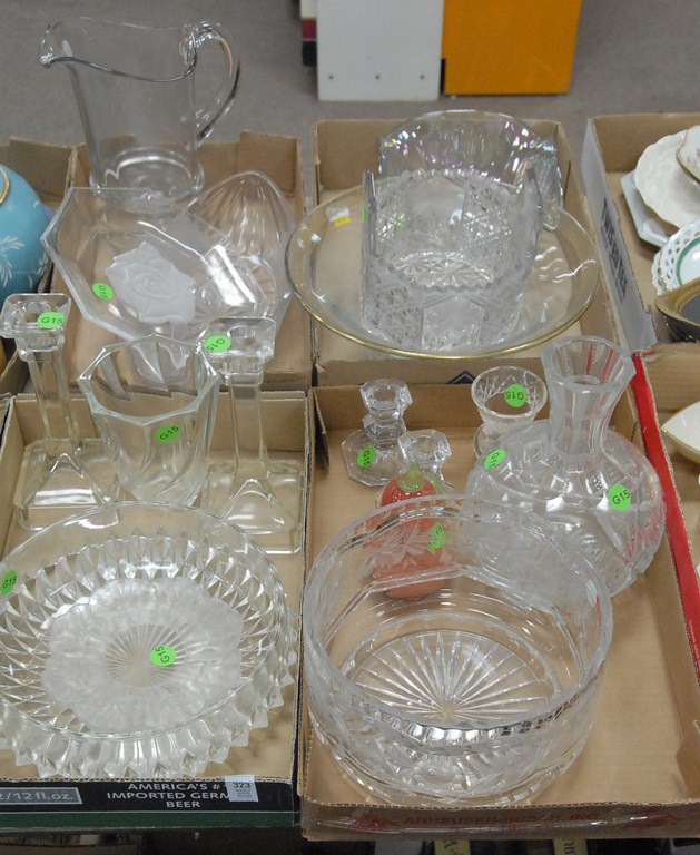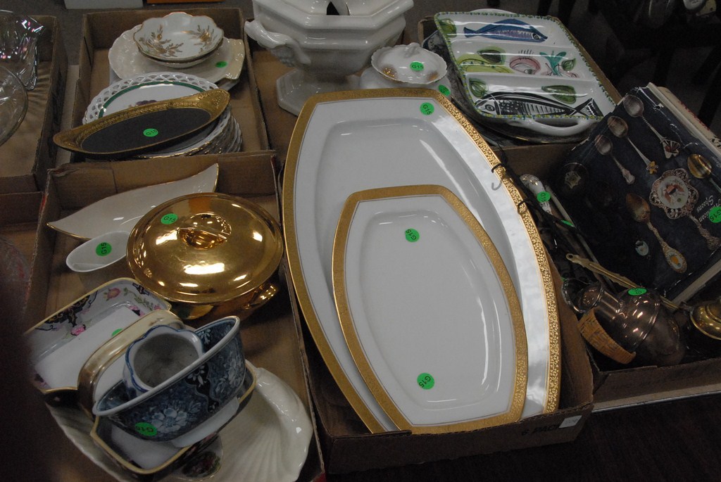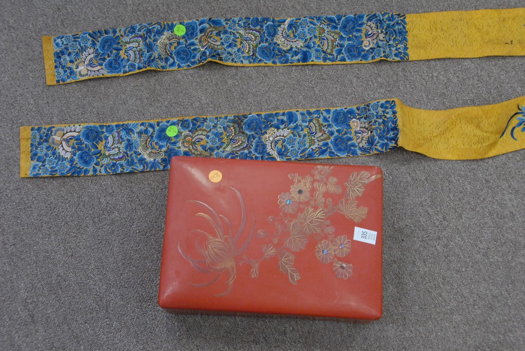 Three items to include a small apple green glazed water coupe, ht 1 1/2, dia 2 3/4, a carved red glass water coupe, carved in low relief of blossoming trees, ht 1 1/2 dia 3, and a shallow blue and white phoenix bird dish, lg. 7 wd 6