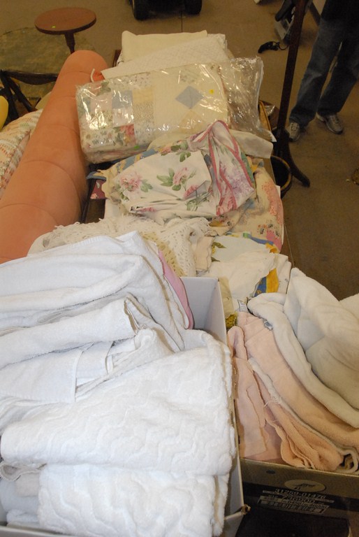 Table lot of linens quilts, antique quilts, 20th century quilt, and towels.