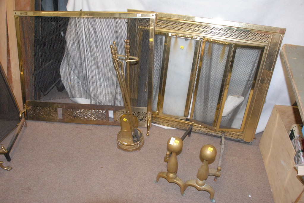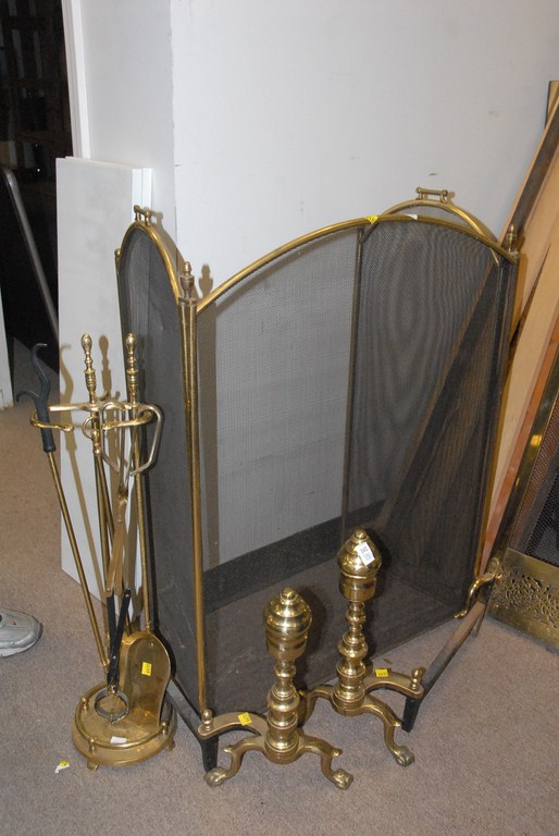 Fireplace equipment andirons, tools, glass screen, and draw screen.