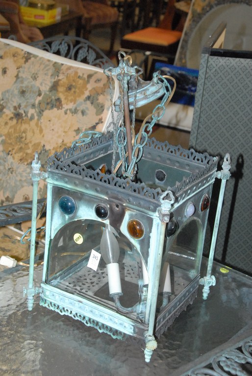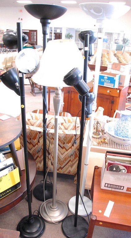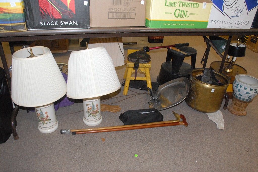 Large group table lamps, shredder, brass hanging rack, waste paper basket, bathroom scale.