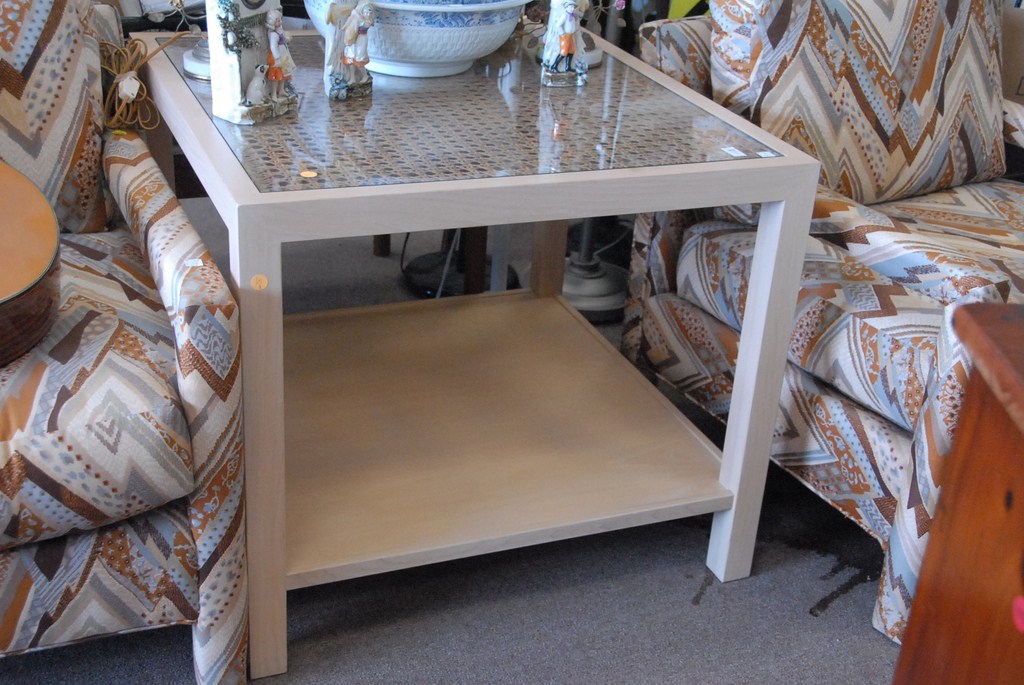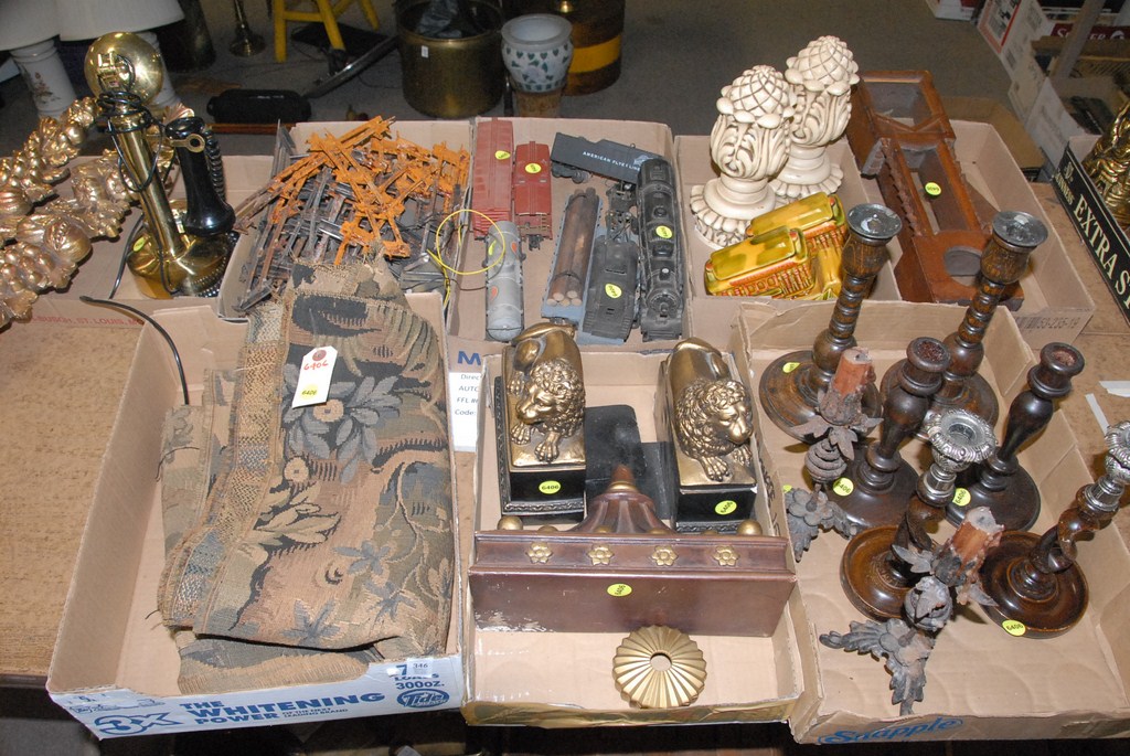 Eight box lots watch hutch, train set, reproduction brass stick phone, machine made tapestry, candlesticks, Hartford Dairy Company sign, woven picnic basket, brass box, and three tennis rackets, etc.