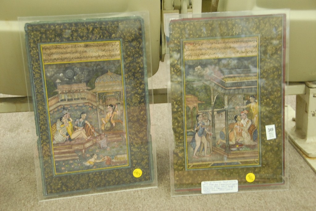 Two Persian manuscript leaves, 19th century noble man carousing with harem women.