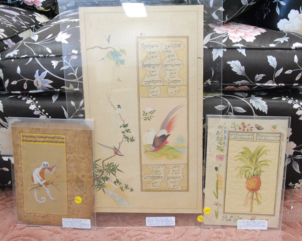 Three small watercolors on paper Persian manuscripts one of monkey and one of fruit and one of birds.