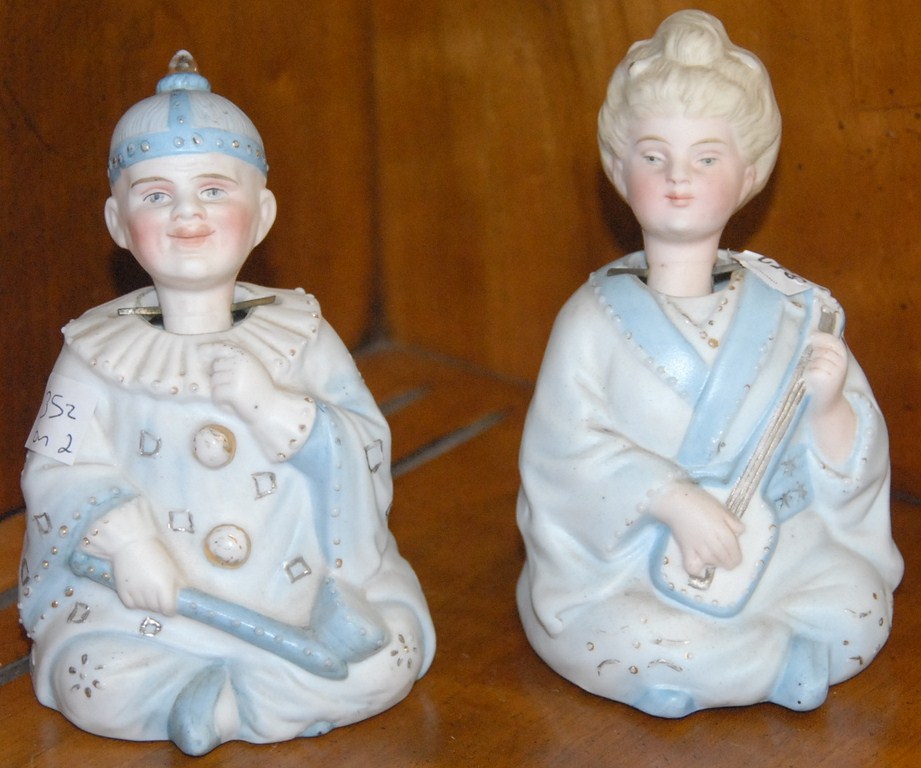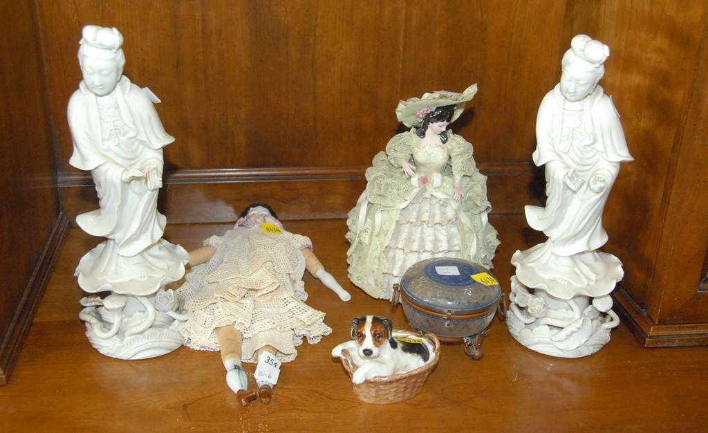 Six piece lot Royal Doulton dog, little covered jar, pair of Oriental white figures, China head doll, and porcelain figure.
