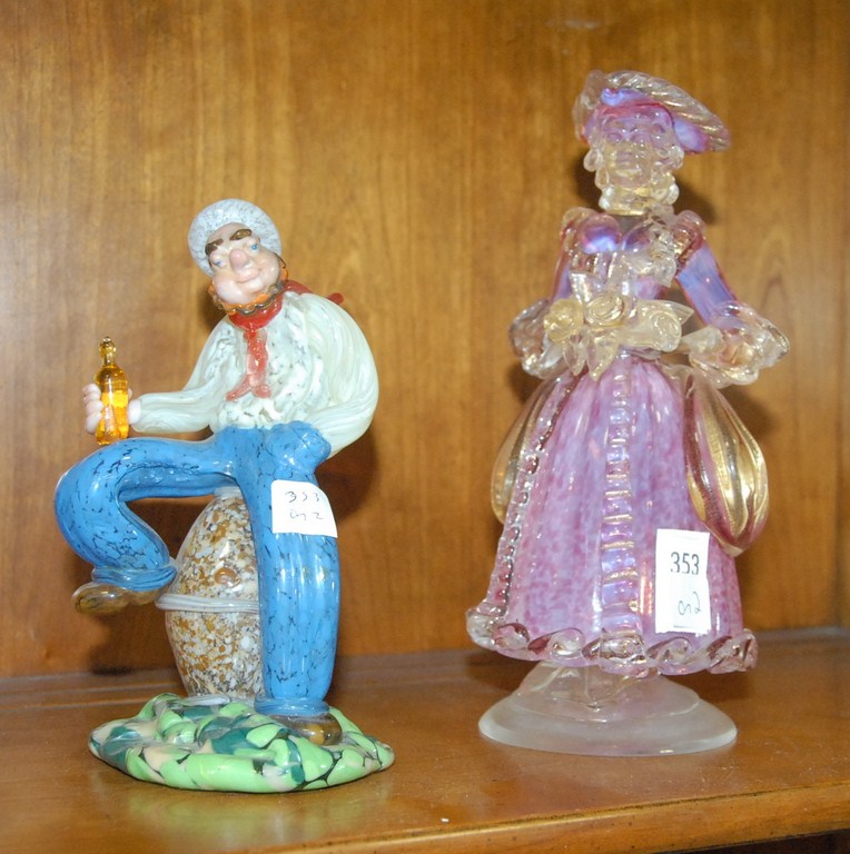 Pair of Murano glass figures man with liquor bottle and girl in a dress.