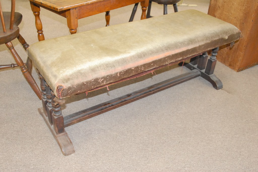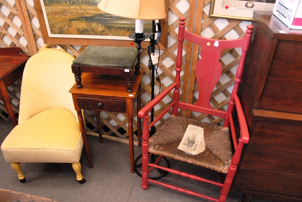 Group lot of five pieces Queen Anne style armchair, metal floor lamp, one drawer stand, foot stool, yellow upholstered chair.