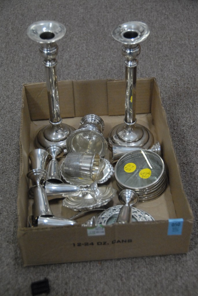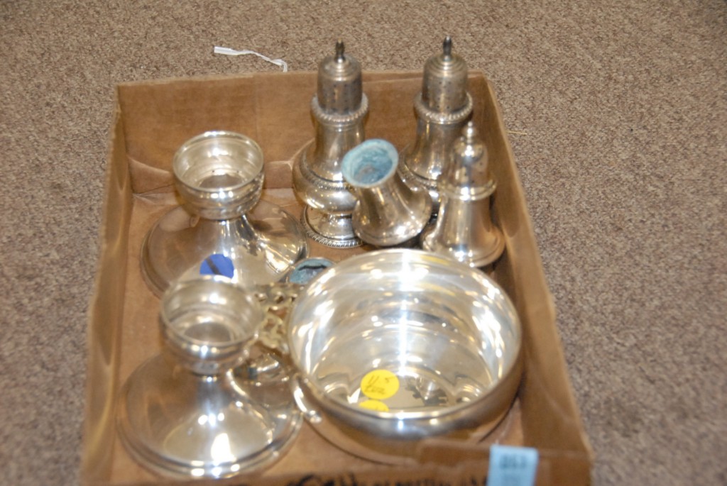 Box lot of sterling silver, weighted and unweighted, 11.7 troy ounces of weighable silver plus weighted pieces.