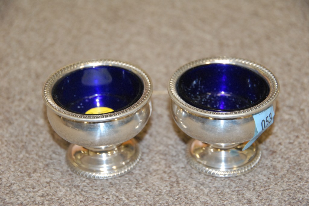 Pair of sterling silver salts with cobalt liners, 3.5 troy ounces.
