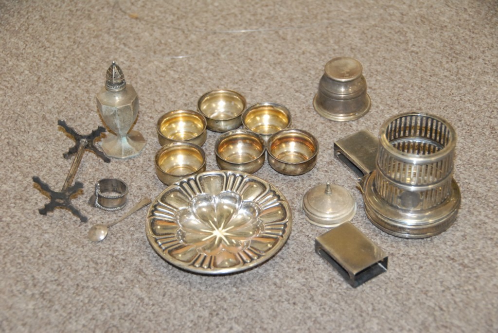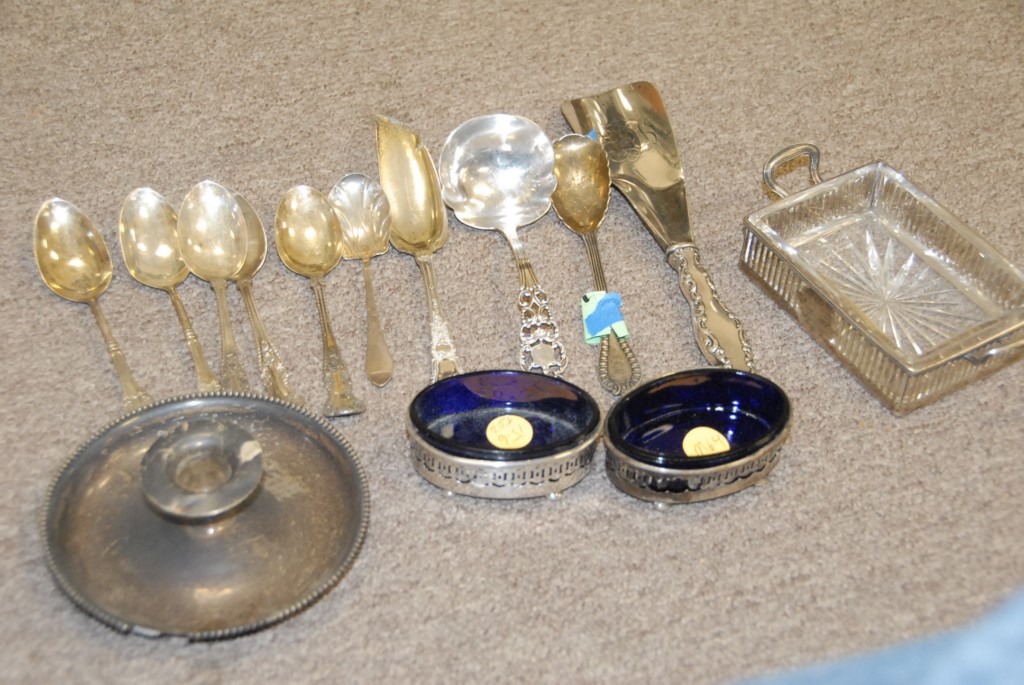 Bag lot of sterling silver salts with cobalt liners, candlesticks, spoons, and miscellaneous pieces, 15.6 troy ounces.