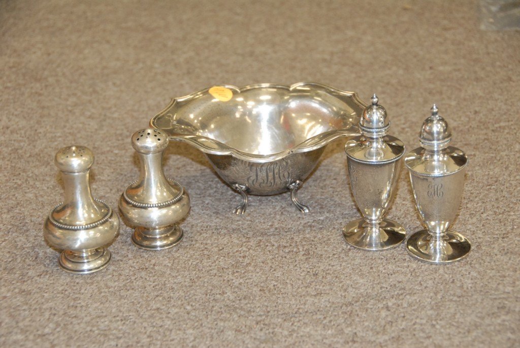 Group lot of sterling silver footed bowl and four salt and pepper shakers, 12.2 troy ounces.