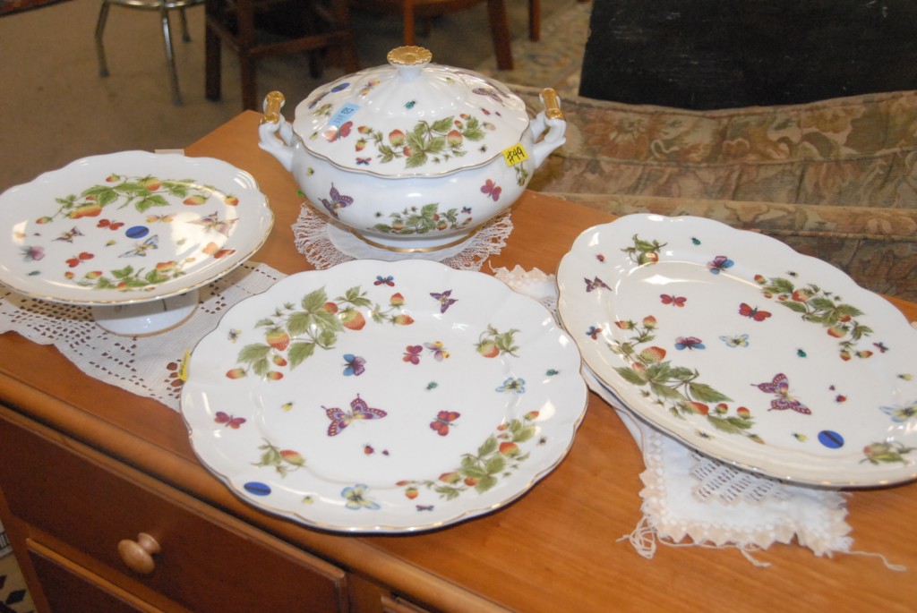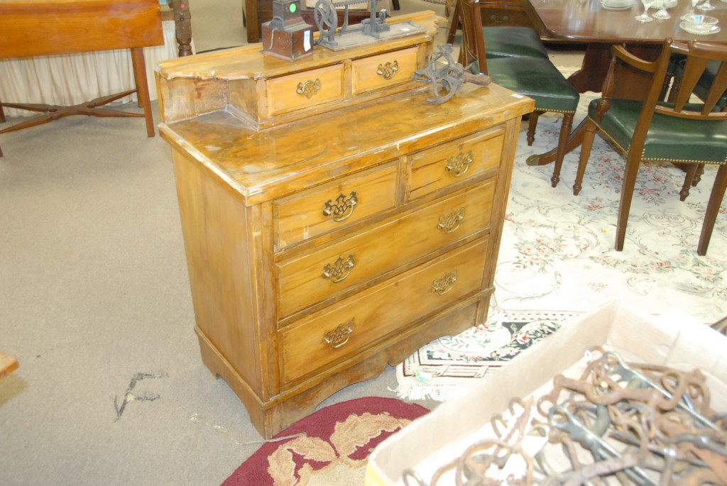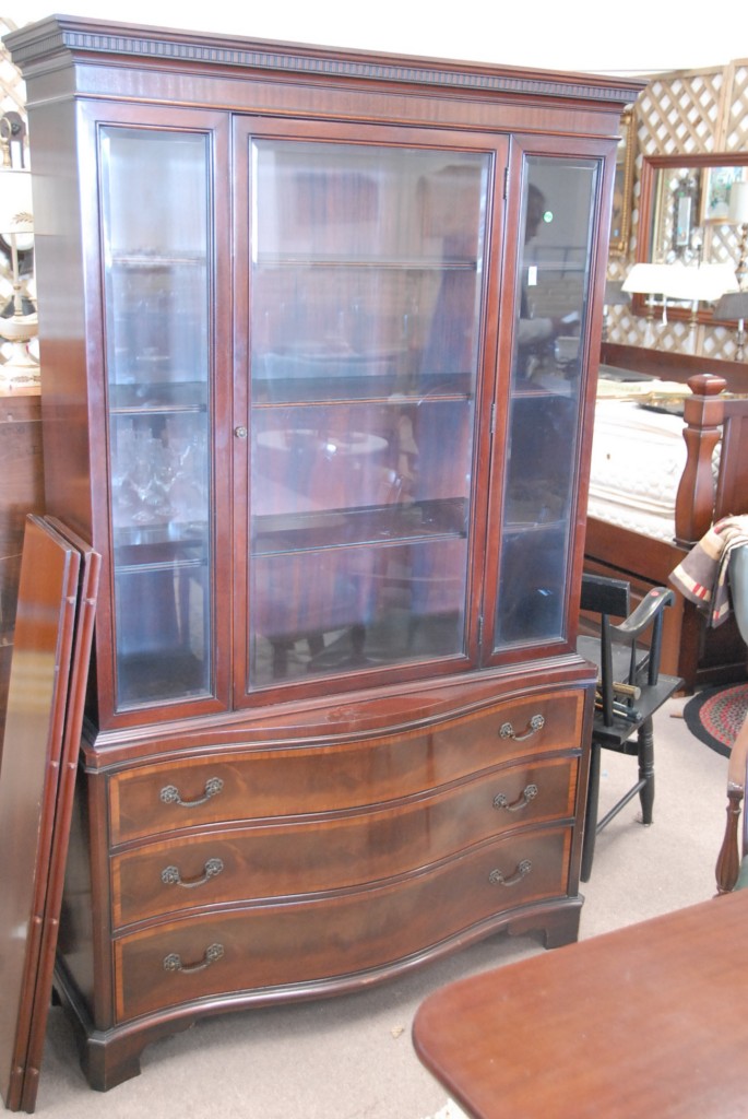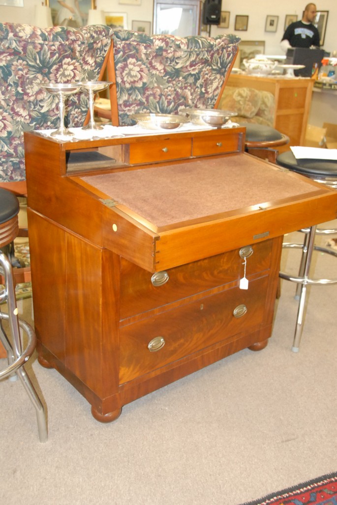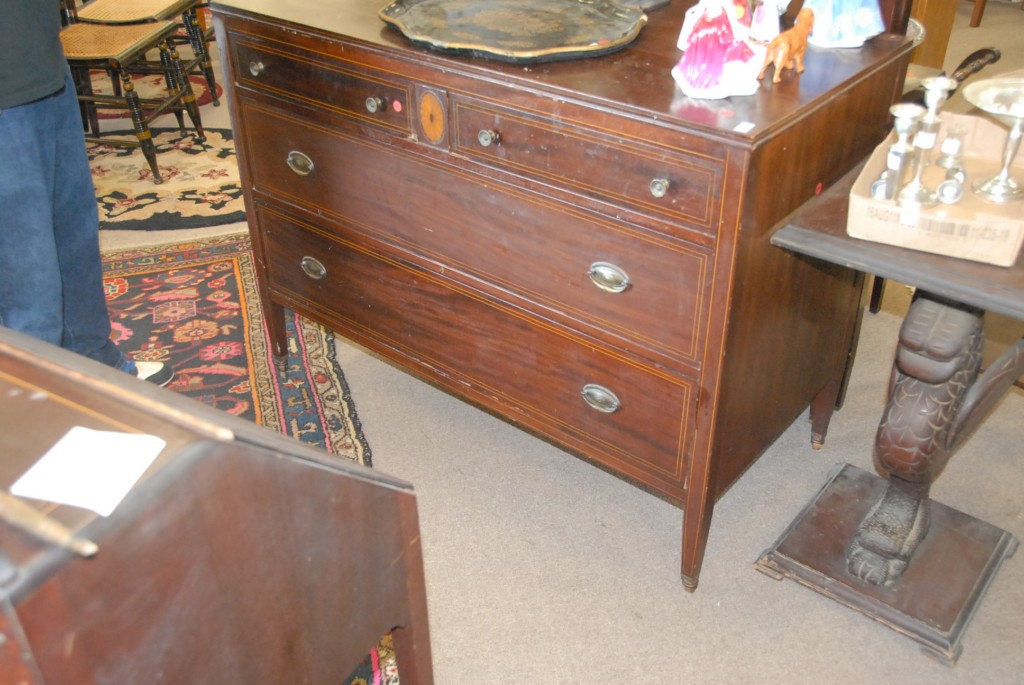 Five piece mahogany lot pair of twin inlaid beds, inlaid chest, inlaid lady’s desk, and inlaid stand.