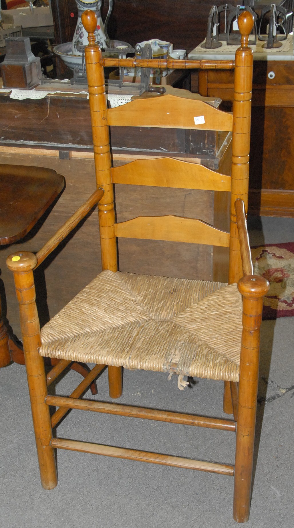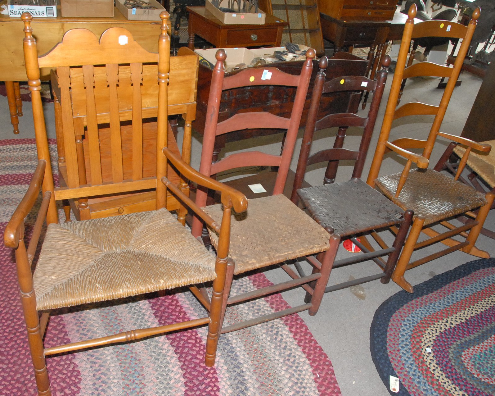 Group of four primitive chairs two ladderback side chairs, ladderback great chair and bannister back armchair.