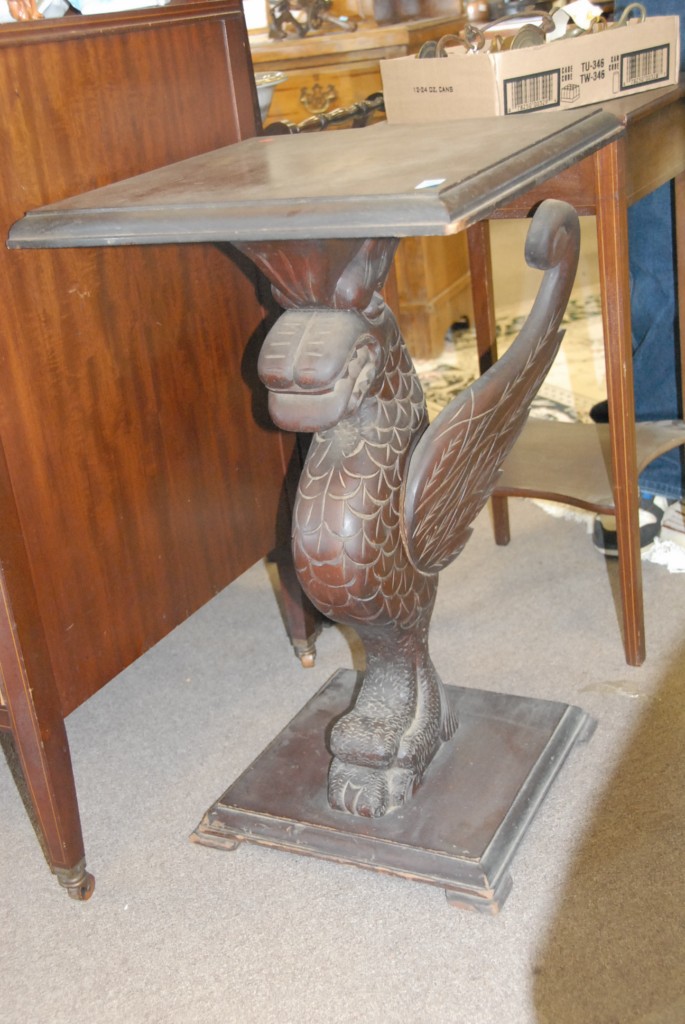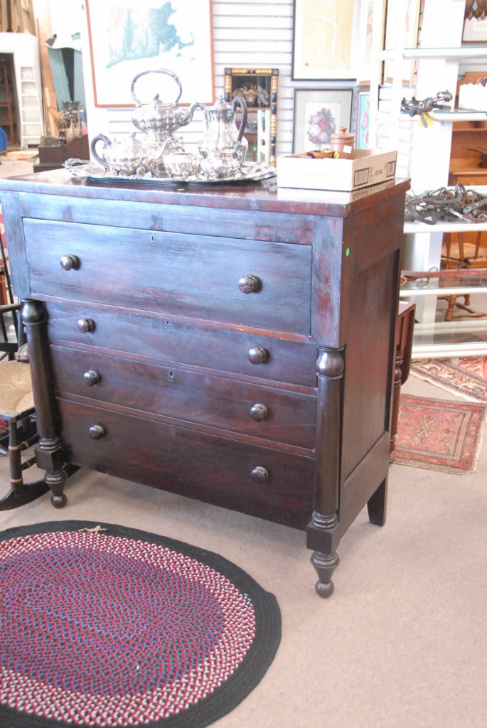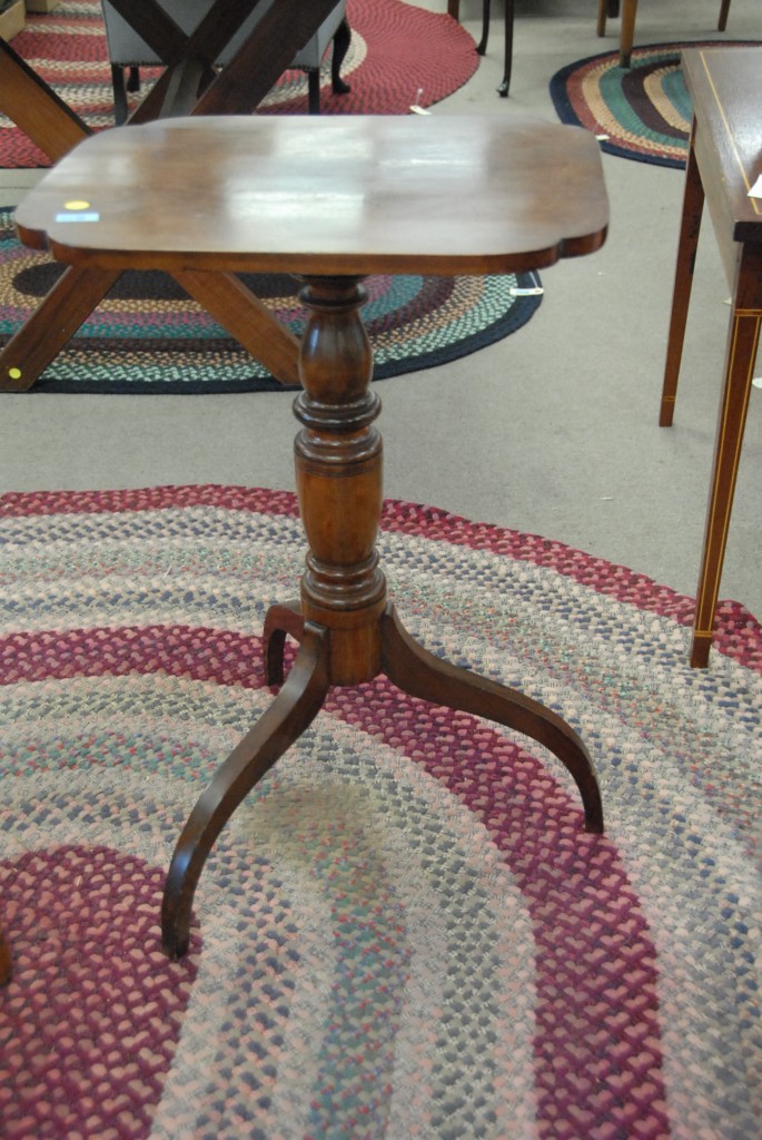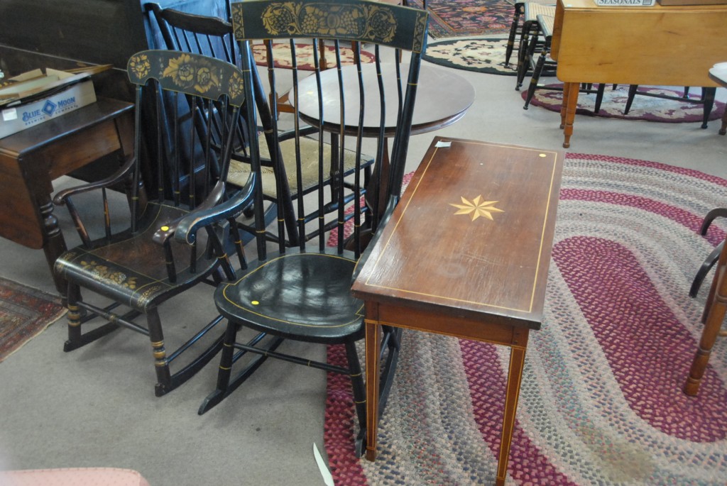 Five piece lot three primitive rockers with paint decoration, small rectangular mahogany table and mahogany candlestand.
