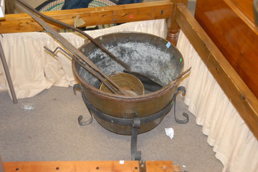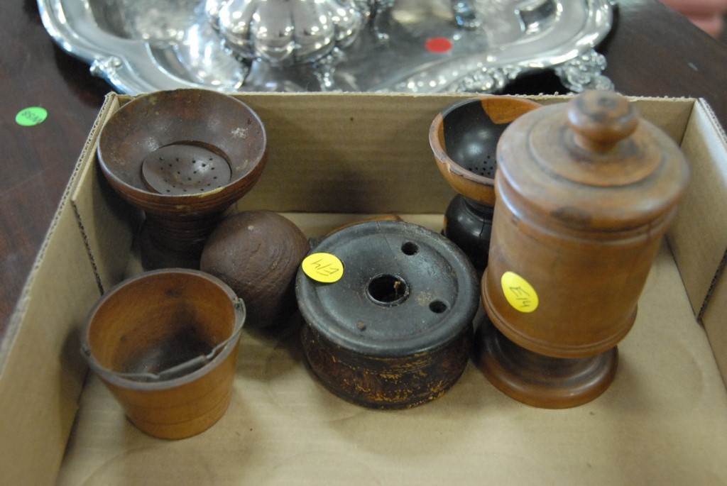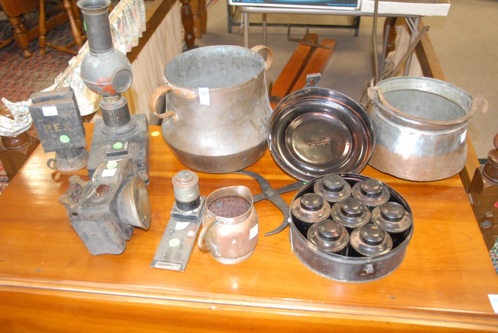 Primitive lot early magic lantern, two early lanterns, copper, and round tole covered container with spice containers inside.
