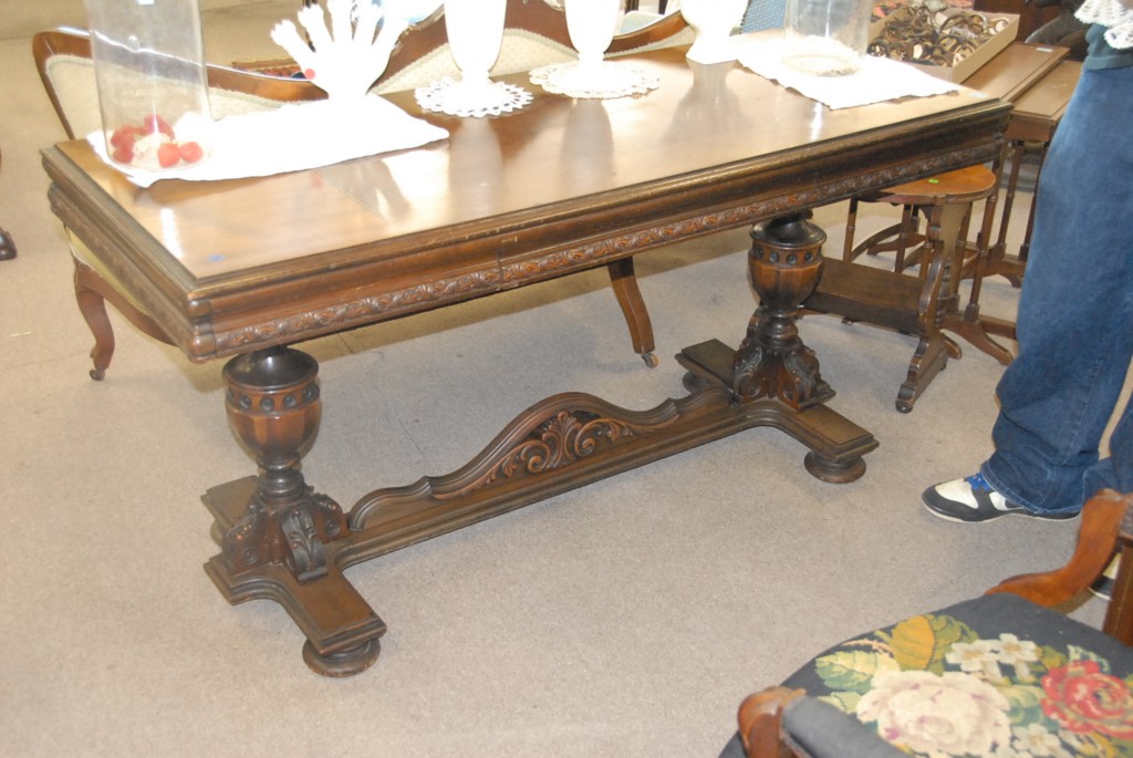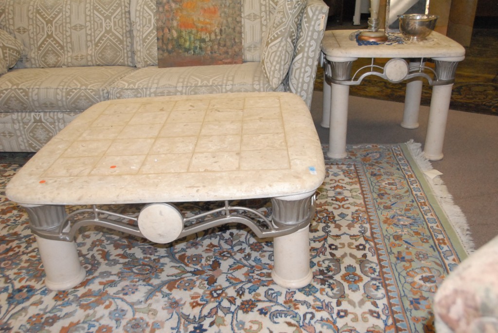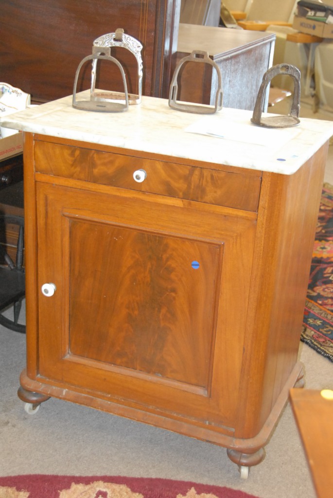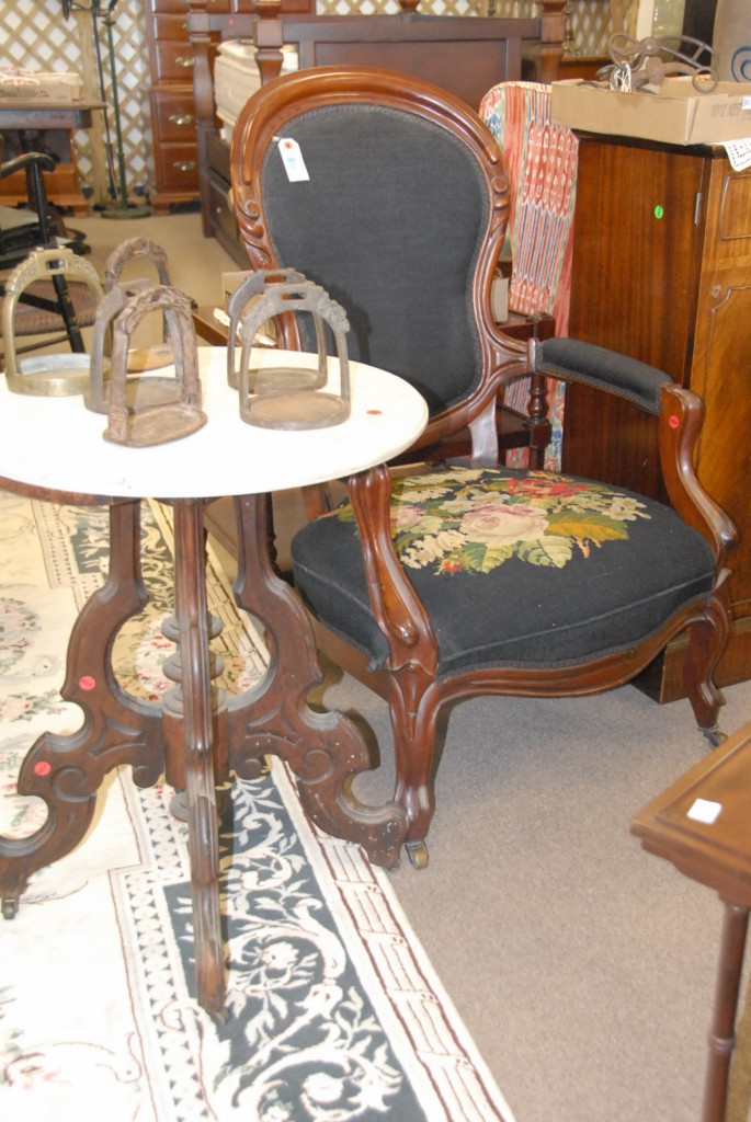 Two Victorian gents chairs, each with needlepoint seats and Victorian marble top table.