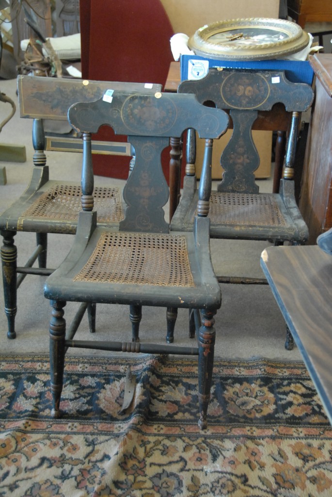 Three fancy Sheraton side chairs with caned seats in original paint.