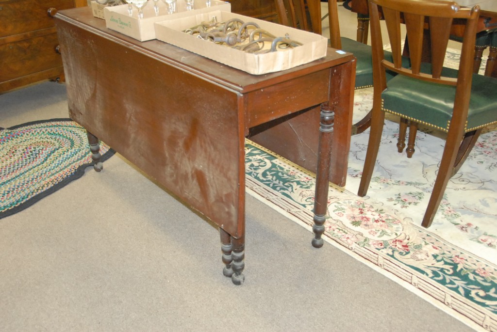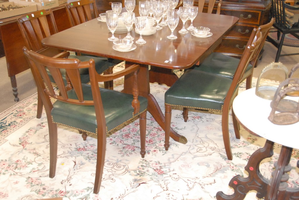 Seven piece dining set mahogany drop leaf table and six mahogany chairs with leather seats.