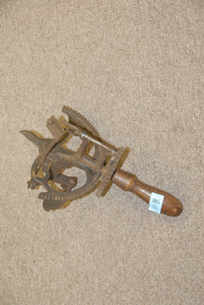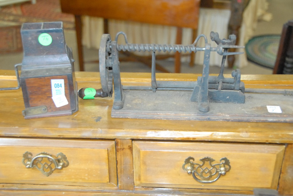 Two piece primitive lot one apple peelers and nutmeg grinder.
