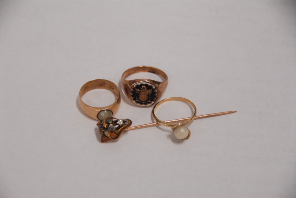 Bag lot of 14kt gold three rings and stick pin, 17 grams.