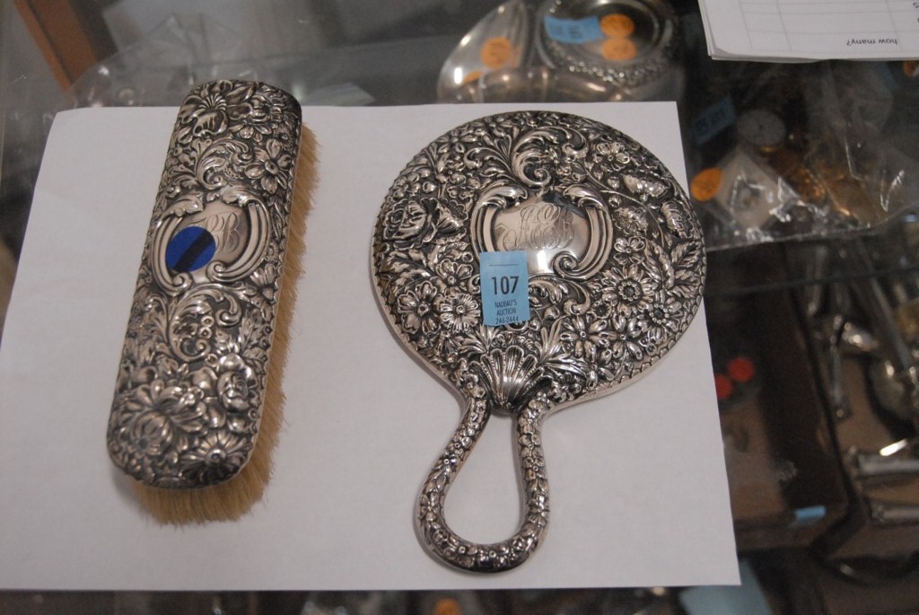 Repousse sterling silver hand mirror and brush.