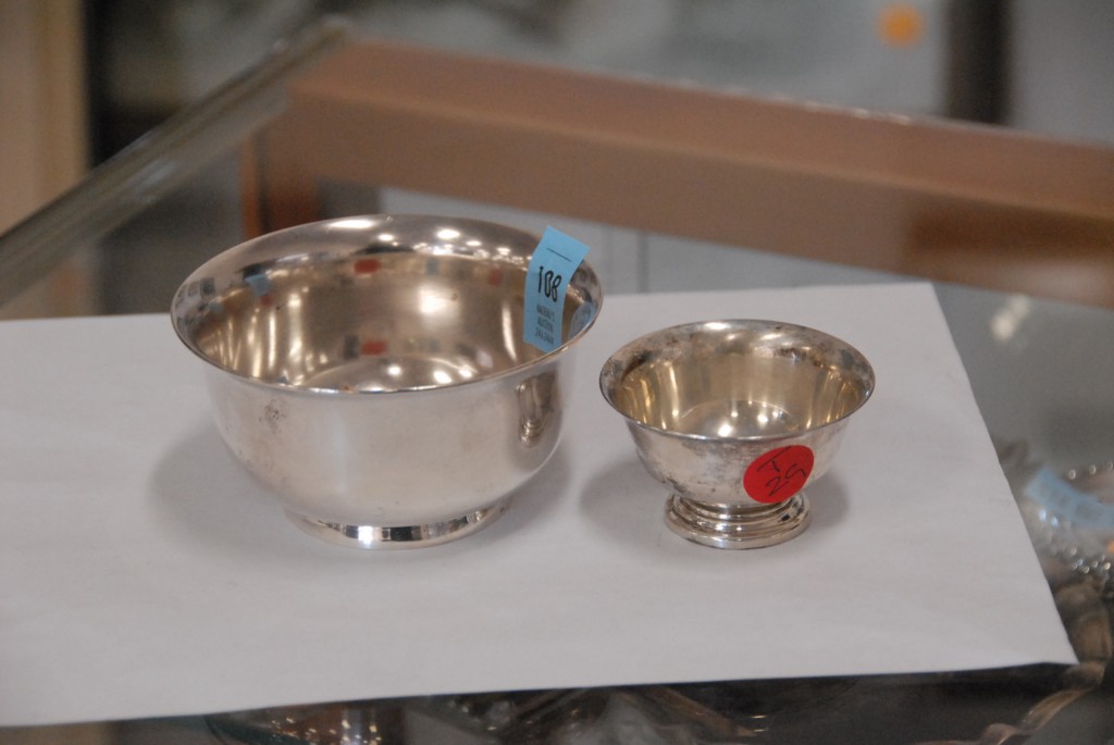 Two sterling silver small Revere style bowls, one signed Tiffany, 7.3 troy ounces.