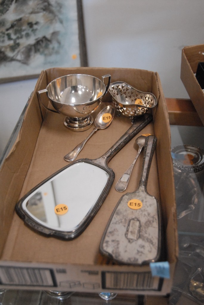 Box lot of sterling silver sugar bowl, reticulated bowl, one spoons, mirror, and brush.