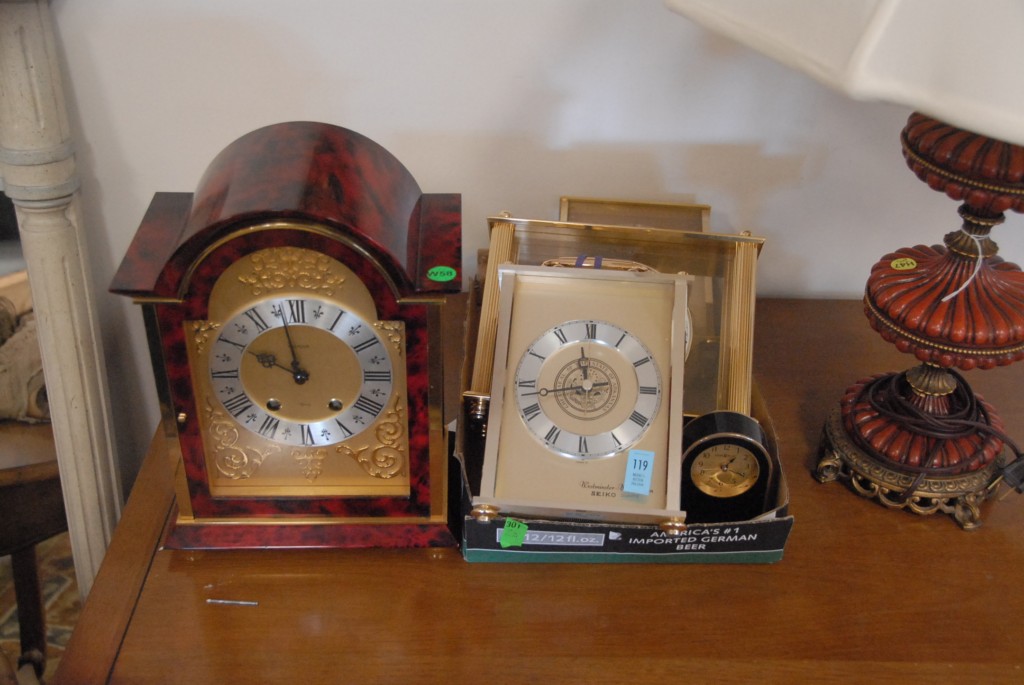 Group of five clocks, one marked Luxor.