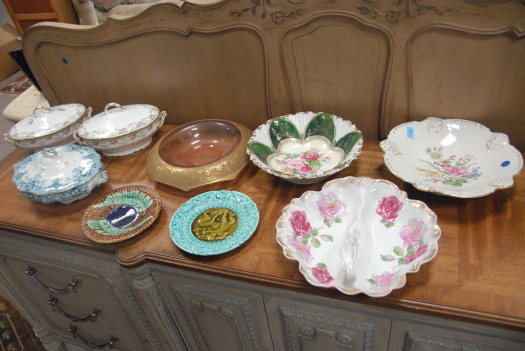 Nine piece lot three covered vegetable dishes, two Majolica plates, and three bowls one signed RS Prussia.