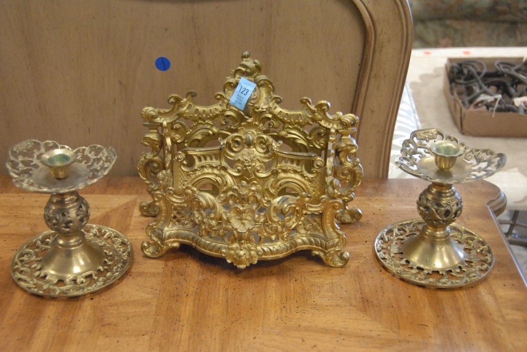 Three piece brass lot letter holder and two candlesticks.