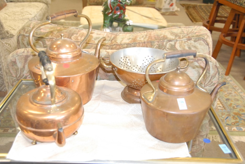 Four pieces of copper strainer and three teapots.