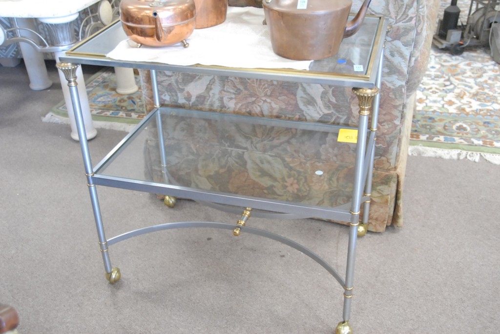 Metal brass trimmed tea car with glass shelves.