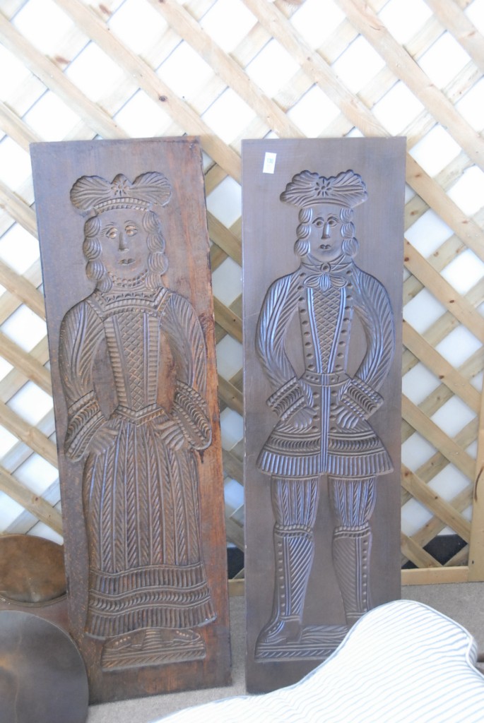 Pair of boards cut to molds of Pennsylvania Dutch man and woman.
