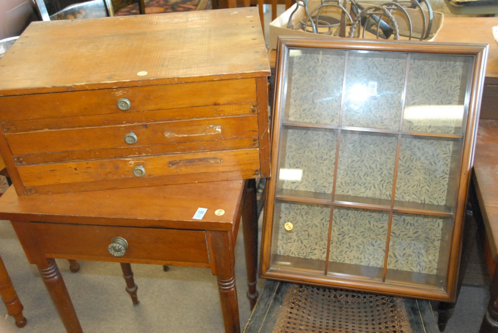 Two piece lot small three drawer cabinet and hanging curio cabinet.