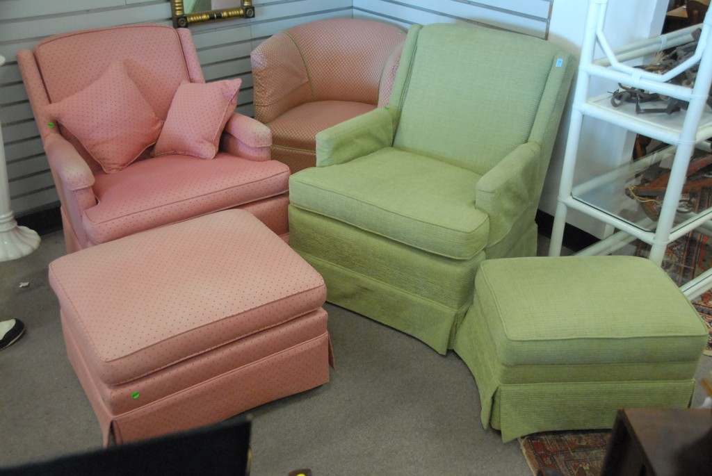 Five piece lot three upholstered easy chairs and two footstools.