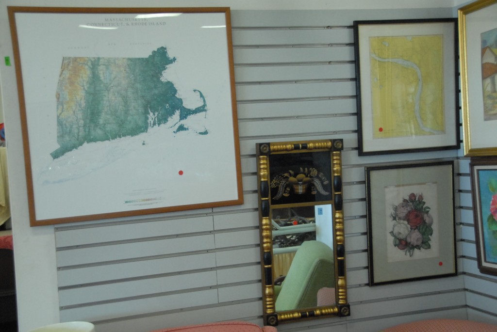 Four piece lot Hitchcock mirror, two maps, and print of flowers.