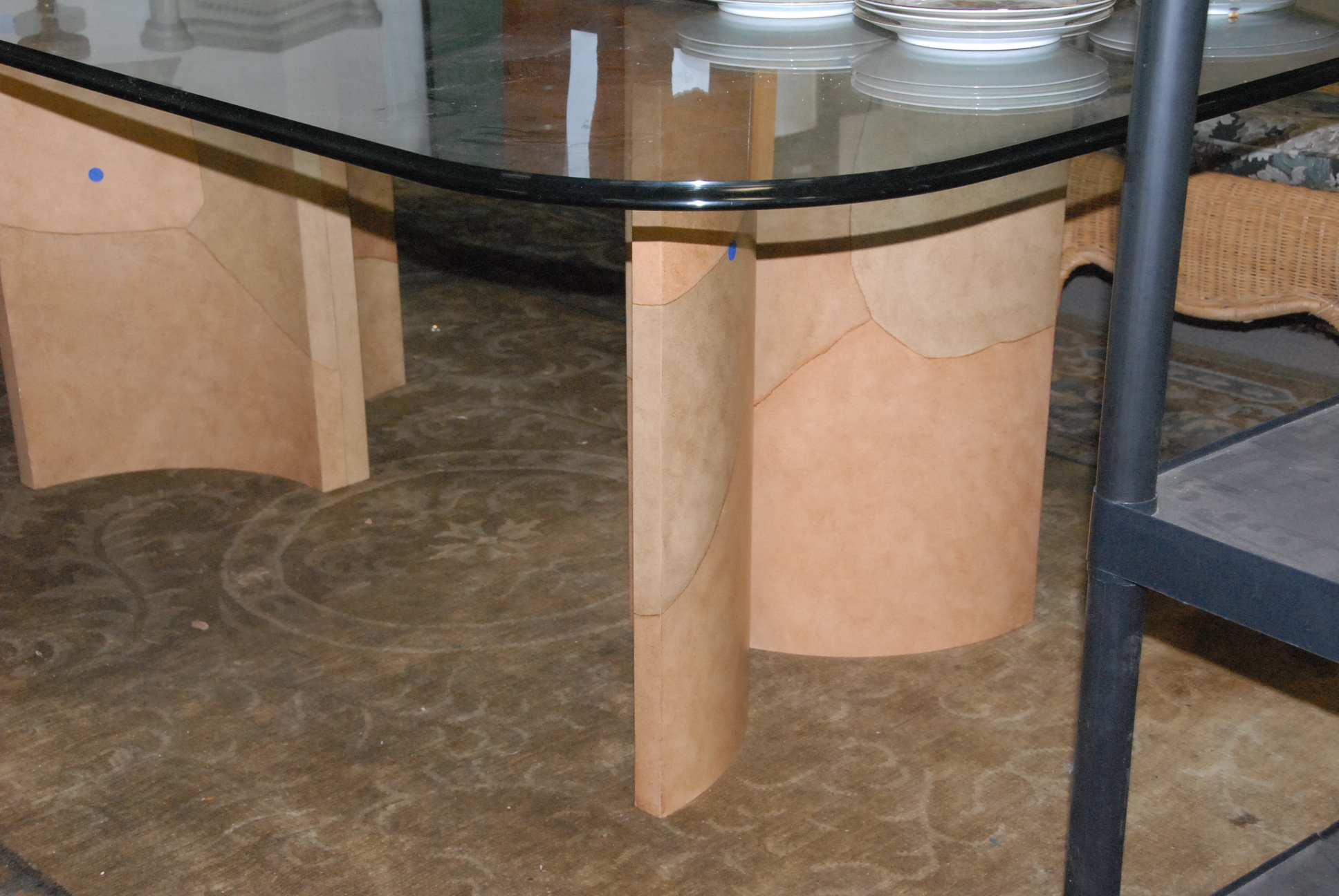 Contemporary glass top table with double base.