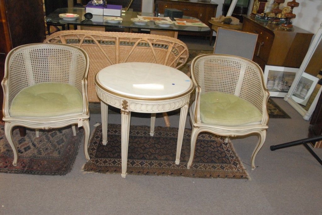 Three piece lot two caned back chairs and round marble top table.