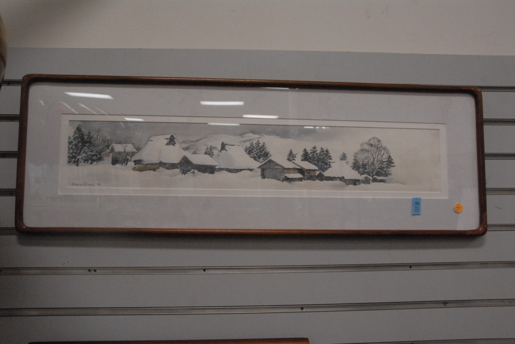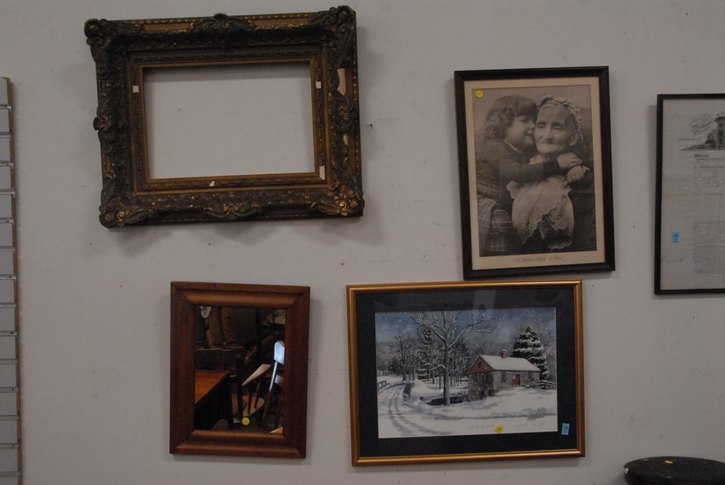 Four piece lot watercolor of Gurleyville Grist Mill signed Tyler, Victorian frame, print of photo, and small mirror.