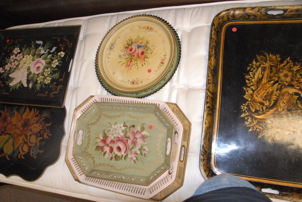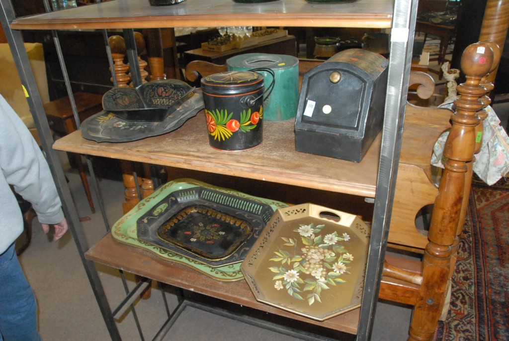 Fourteen piece lot of Toleware trays and containers plus primitive wooden items.