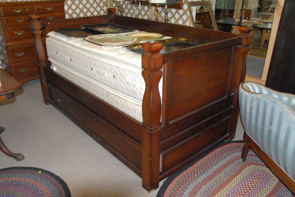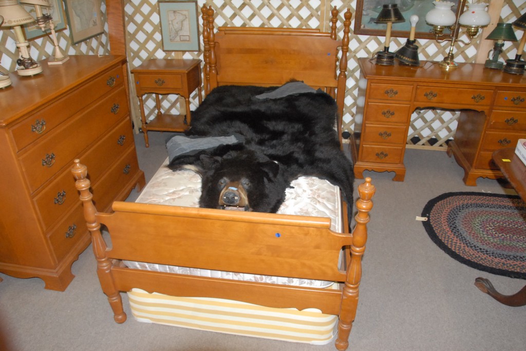 Seven piece maple bedroom set chest on chest, chest and mirror, night stand, two twin beds, and desk.
