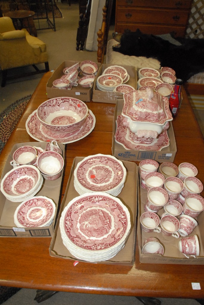 Large partial set of Mason’s red and white china Vista England pattern including large tureen and underplate.