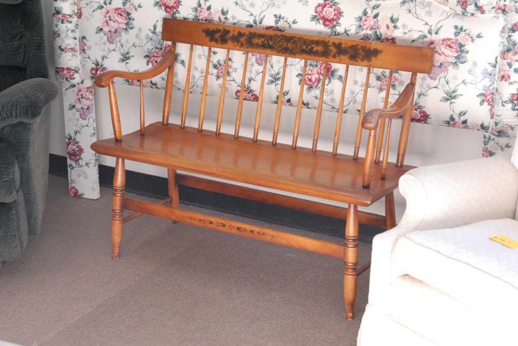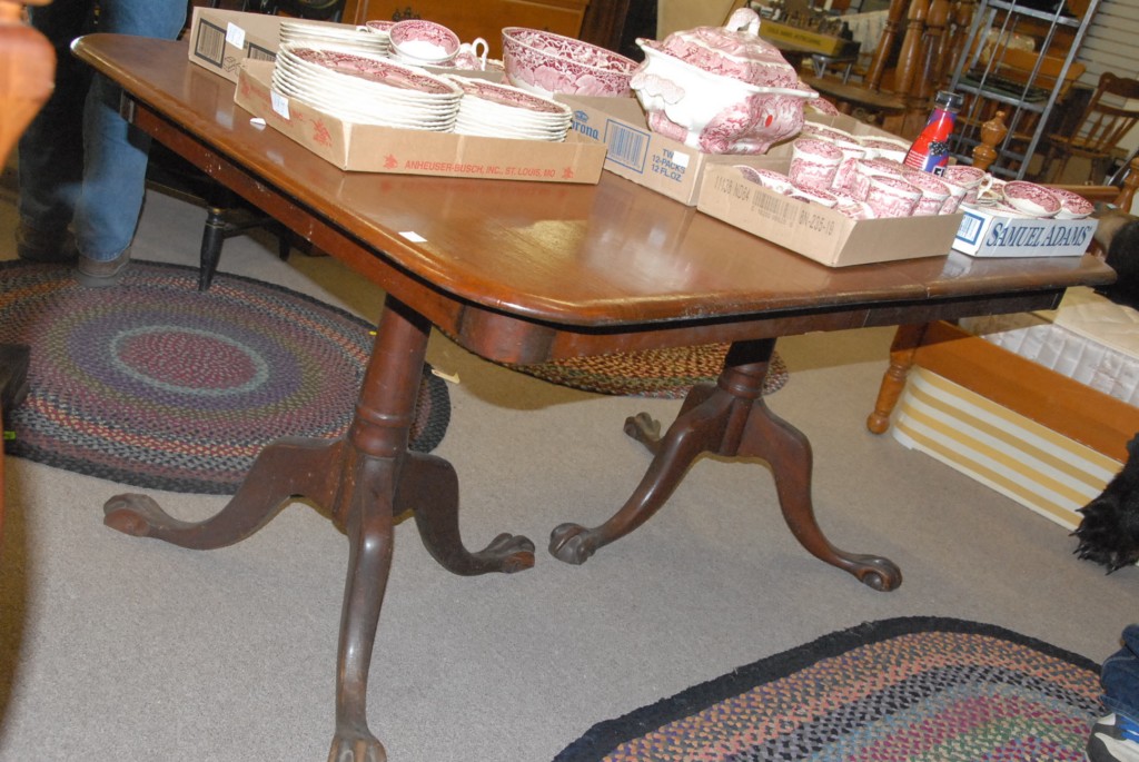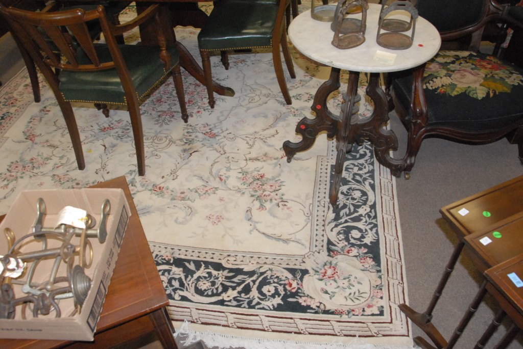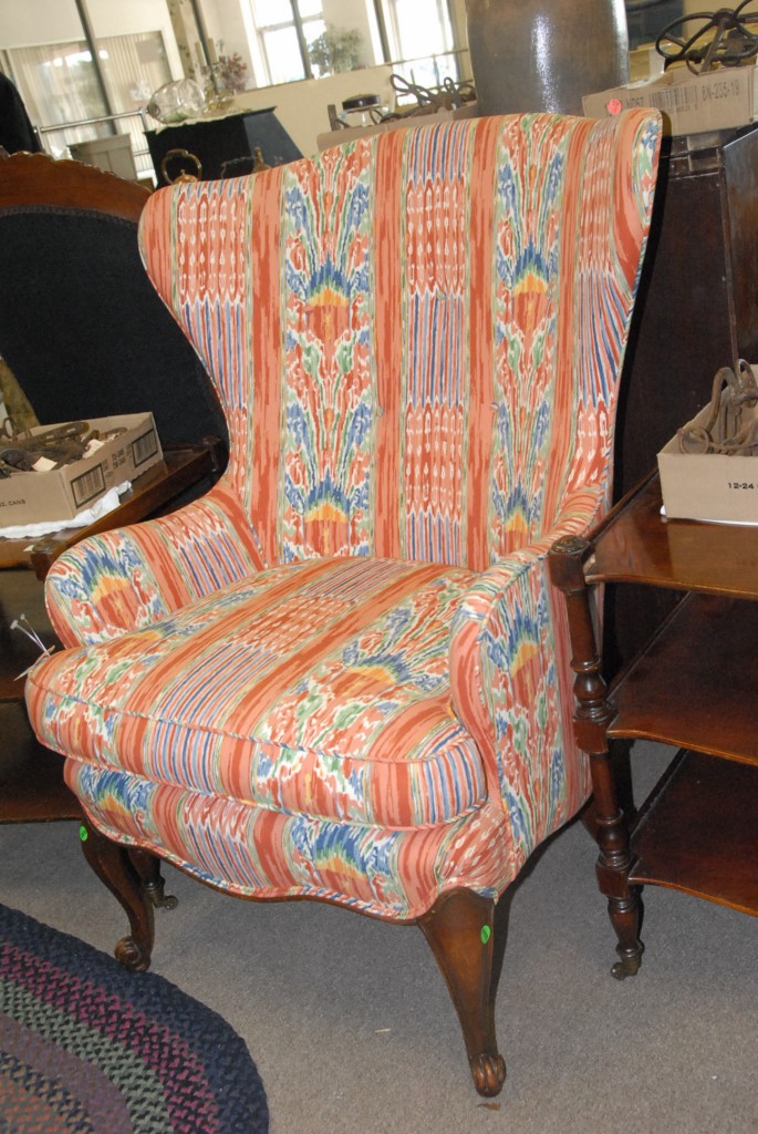 Three piece lot candlestand, one drawer stand, and Chippendale style upholstered wing chair.