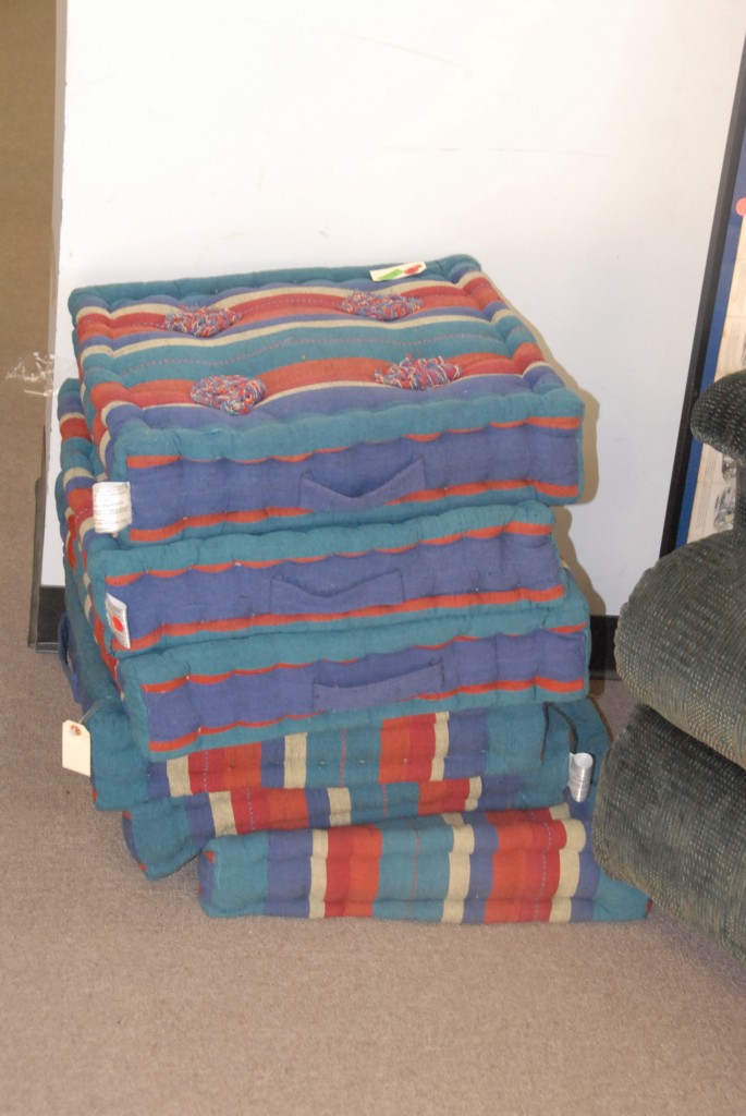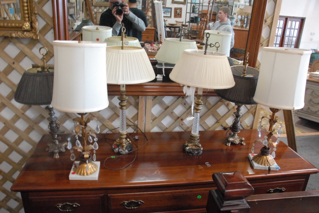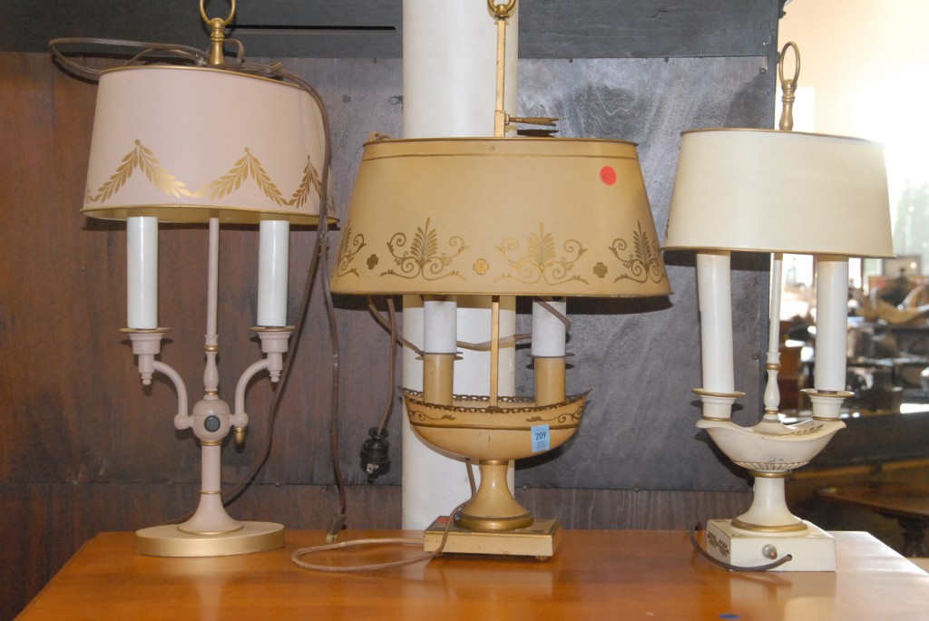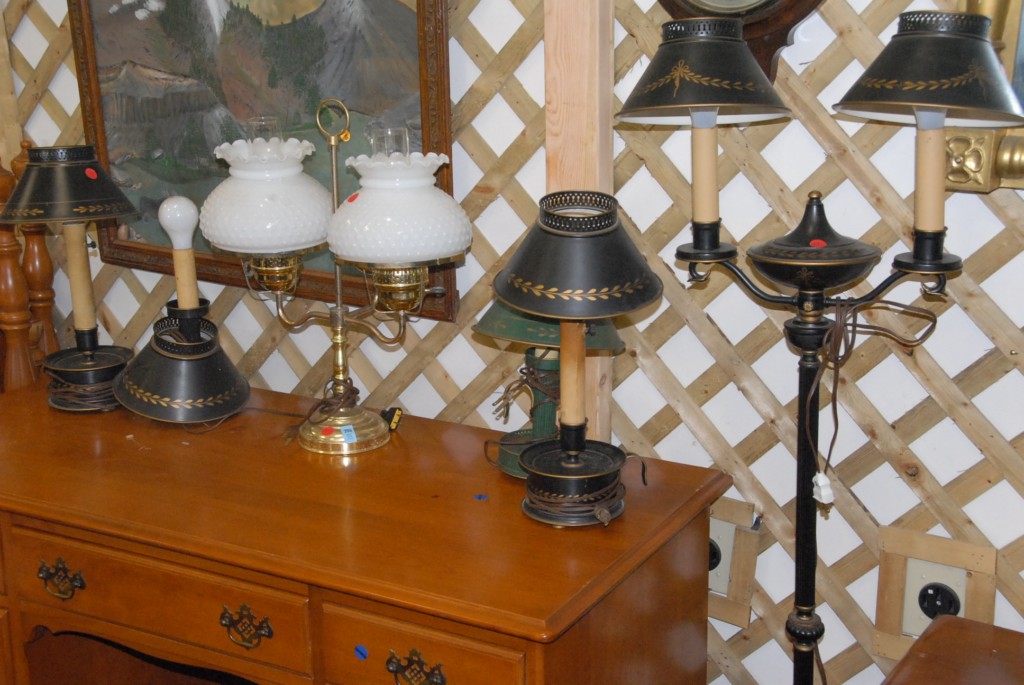 Eight lamps, mostly with tole shades, table lamps and floor lamps.